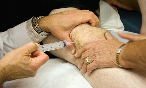 Если количество крови в суставе превышает 25-30 мл, необходима пункция. Пункцию выполняют под местной анестезией. Сначала по наружне-боковой поверхности сустава, чуть ниже надколенника вводят тонкую иглу, чтобы обезболить мягкие ткани и капсулу. Затем иглу меняют на специальную, более толстую и длинную. Кровь удаляют, полость сустава промывают новокаином. При необходимости вводят гидрокортизон или триамцинолон.