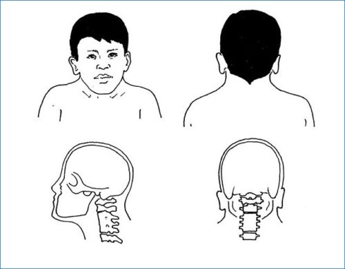Во время осмотра пациентов врачи отмечают наличие короткого и деформированного шейного отдела позвоночного столба. Количество позвонков может быть меньше нормы.