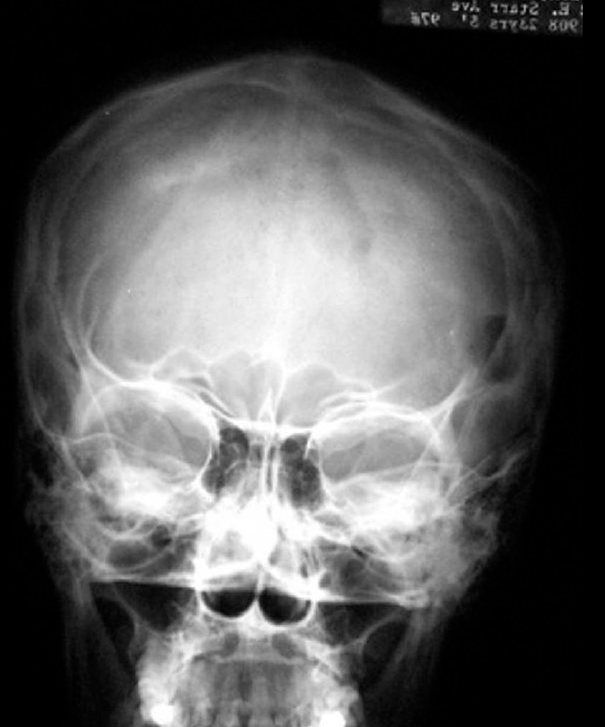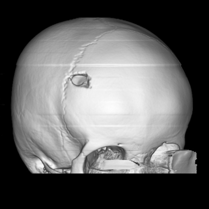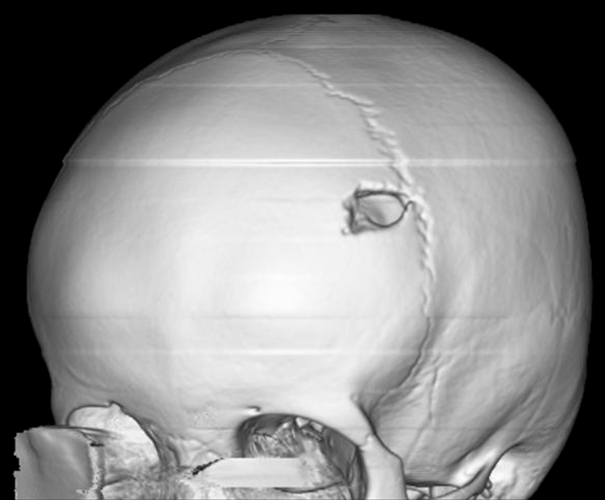 Молодой человек 17 лет был госпитализирован по поводу увеличивающегося в течение последних 6 недель образования волосистой части головы. Образование при пальпации болезненно, из‑за изъязвления периодически кровоточит, однако неврологического дефицита не выявлено. При КТ и МРТ выявлен крупный очаг в лобной кости справа, сдавливающий верхний сагиттальный синус. Проведена тотальная резекция образования, подтвержден диагноз «лангергансоклеточный гистиоцитоз кости черепа». На амбулаторном этапе проводилась терапия цитостатиком.