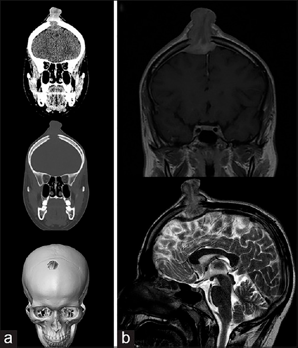 Рисунок 6. (а) КТ-исследование без контрастирования — фронтальное сканирование (верхняя и средняя часть) и 3D-реконструкция черепа (нижняя часть). (b) МРТ-сканирование. Т1‑взвешенное изображение во фронтальной плоскости (сверху) и Т2‑взвешенное изображение в сагиттальной плоскости