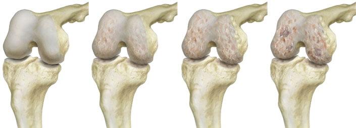 По мере прогрессирования болезни хрящ полностью разрушается, приводя к обнажению костей сустава, которые быстро реагируют на нехватку хрящевой ткани и образуют на своей поверхности шипы (остеофиты). Подобное состояние приводит к деформированию и частичному искривлению конечности.