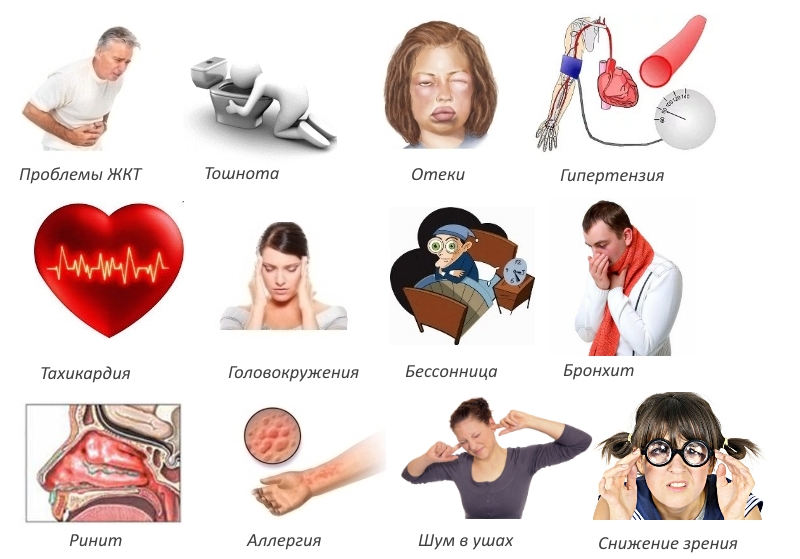 • Говоря о нервной системе, чаще всего наблюдаются такие проблемы, как головная боль и нарушения сна. Возможны резкие перепады эмоционального состояния. Реже пациенты отмечают ухудшение зрения и шум в ушах.