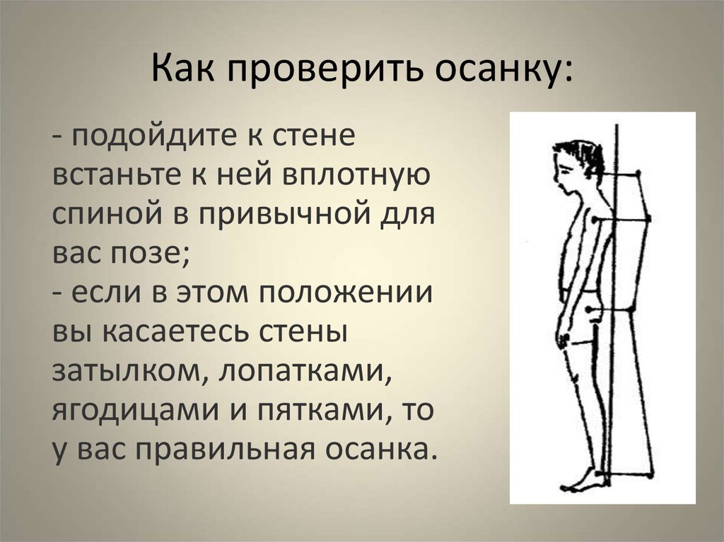 Простейший тест на правильность осанки в сагиттальной плоскости — необходимо встать спиной к стене без плинтуса. Затылок, лопатки, ягодицы, икроножные мышцы и пятки должны касаться стены, расстояние между стеной и телом в районе шейного и поясничного лордозов — примерно 2-3 пальца.