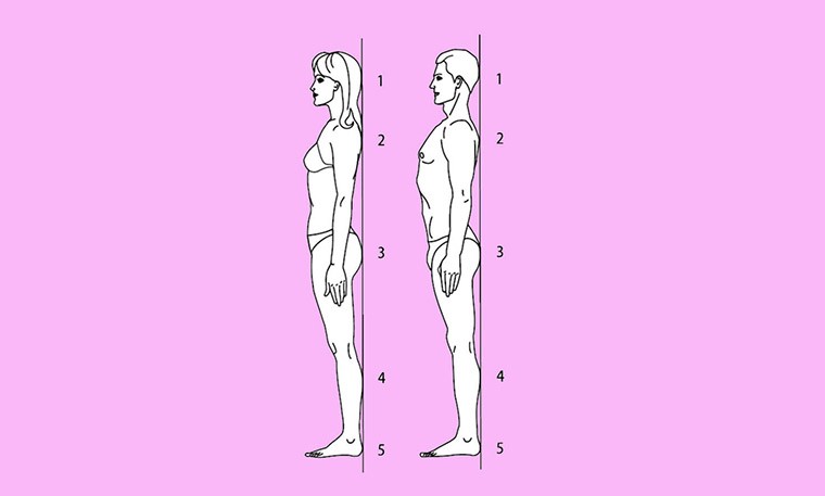 Если встать к зеркалу боком, то прямая линия должна проходить от лодыжки через бедро, плечо и колено до самого уха. При этом живот должен быть втянут, а грудная клетка расправлена.