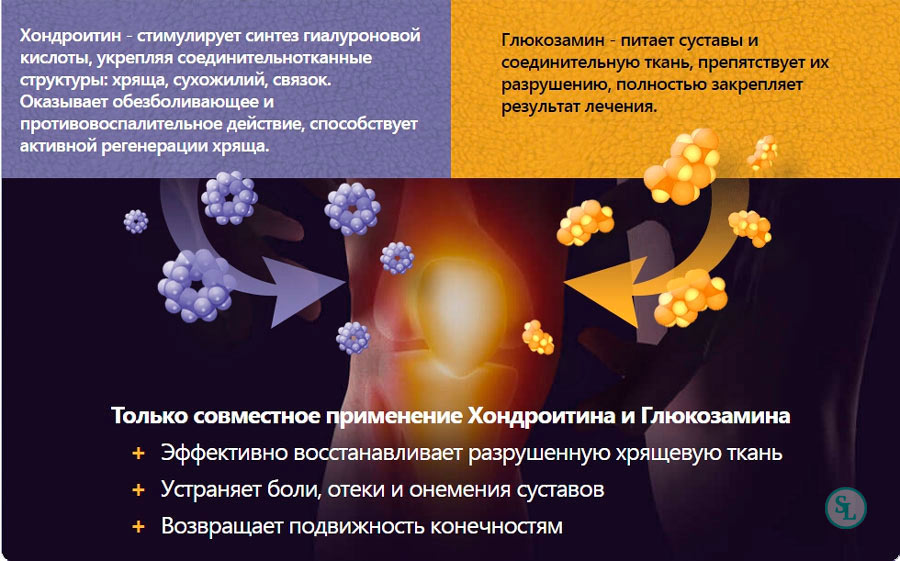 В аннотации, прилагаемой производителем к каждому препарату, указывается, что действующими веществами хондропротекторов выступают глюкозамин и/или хондроитинсульфат. Они представляют собой соединения, являющиеся строительным материалом для формирования соединительной ткани, активизации процессов ее регенерации и предотвращения дегенерации межпозвонкового диска.