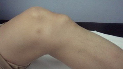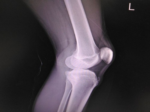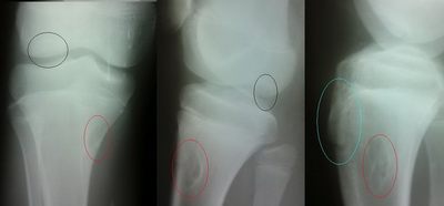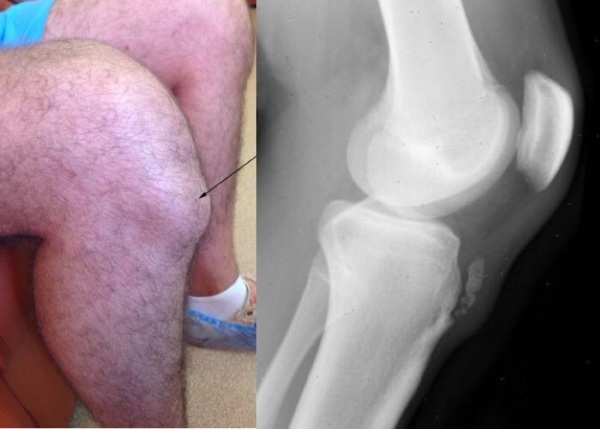 - В последующем также проявляется характерный признак «плавающего надколенника», при котором на выпрямленной ноге коленная чашечка свободно смещается вверх при надавливании на нее. Бугристость разрастается за счет хрящевой ткани. Может возникнуть поражение второй конечности. На рентгенограмме отмечаются точки окостенения в виде отростков, количество которых колеблется от 1 до 4.
