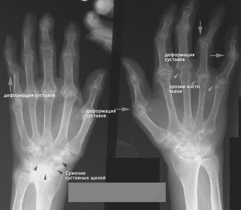 3. Прогрессирующее разрушение суставов приводят к выраженным деформациям пальцев и постоянной сильной боли в руках; из-за ограниченной подвижности кисти наблюдается атрофия мышц и сухожильные контрактуры.
