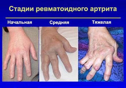 Характерные признаки воспаления суставов пальцев, как правило, наблюдаются на II стадии заболевания, начиная с появления болезненной припухлости, эритемы и крепитации в пораженных суставах, а к рентгенологическим признакам прибавляются множественные сужения межсуставных щелей, кистовидные просветления костной ткани и краевые деформации эпифизов костей. Вывихи, подвывихи и анкилозы суставов выявляют преимущественно на терминальных стадиях заболевания.