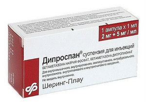 - При интенсивной и затяжной боли делаются внутрисуставные инъекции. Применяются гормональные препараты пролонгированного действия. Один из таких – «Дипроспан». Терапия уместна не чаще, чем 1 раз в полгода.