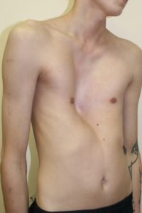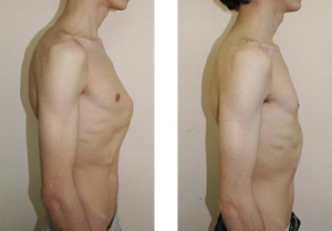 На втором месте по распространенности находится килеобразная деформация грудной клетки. По статистике, она встречается в пять раз реже, чем ВДГК. При этой патологии грудина сильно выдается вперед, образуя характерный выступ. Он действительно напоминает киль или птичью грудку, что хорошо заметно на фото больных. Считается, что данное заболевание детерминировано генетически – у 26% больных оно есть в семейном анамнезе.