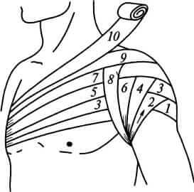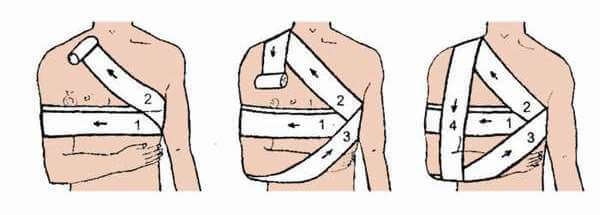Иммобилизирующий бандаж накладывается после подкладывания в подмышечную впадину ватного ролика. Рука при этом должна находиться в согнутом в области плечевого сустава положении и прижатой к грудной клетке. Туры бинта накладывают в горизонтальном и вертикальном направлениях.